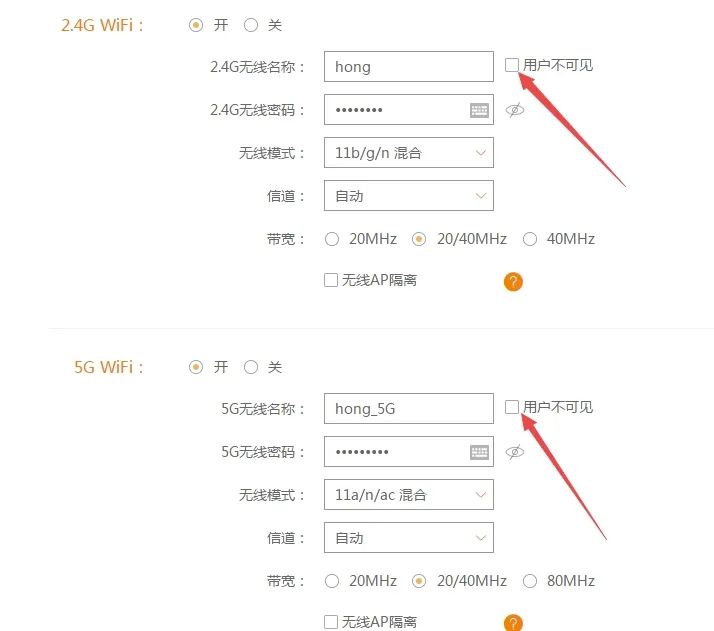 第三步:修改无线参数:如果想要隐藏WIFI,可以点击右边的【用户不可见】按钮。 提示:如果隐藏了无线信号,那么你的手机以及任何人的设备都无法通过无线搜索到你的无线WIFI名称,必须手动添加WIFI名称和密码才能连接到无线信号。所以请谨慎操作。
